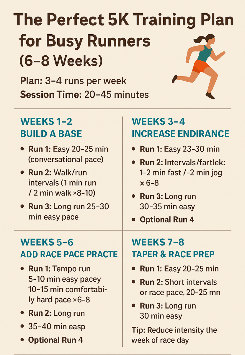 This 6–8 week plan assumes 3–4 days of running per week, with optional cross-training or rest days in between. Each session is designed to be 20–45 minutes, perfect for busy mornings, lunch breaks, or evenings.